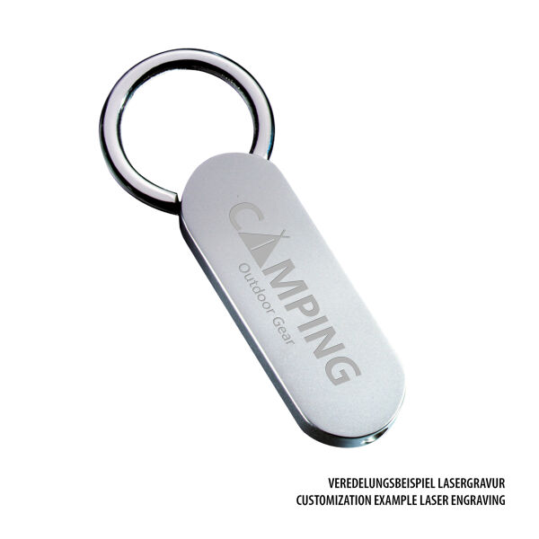 Eenvoud en elegantie: deze metalen sleutelhanger biedt een perfect oppervlak voor een lasergravure. Een stevige sleutelring maakt het artikel compleet.